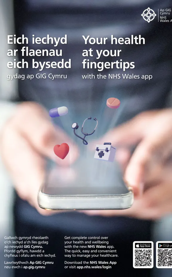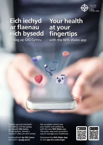 Darperir ein gwasanaethau ar-lein drwy Ap GIG Cymru . Gallwch chi lawrlwytho'r app
